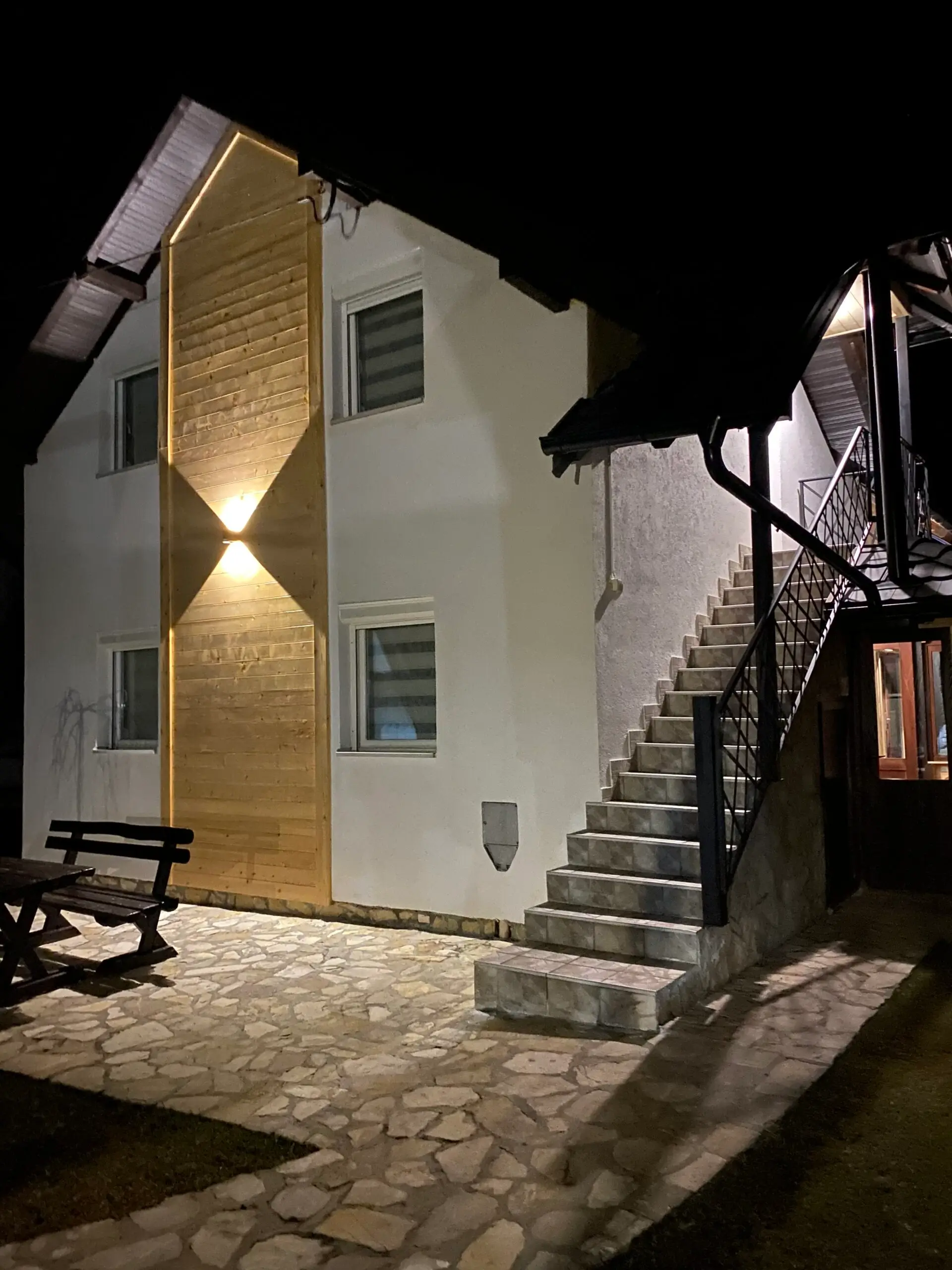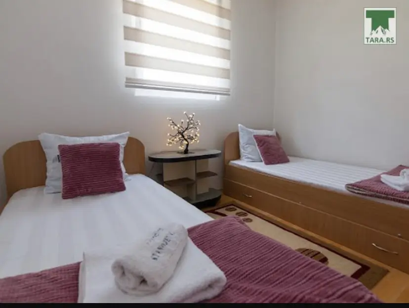 Apartman Stanojević 1 se nalazi u prizemlju i sastoji se od dve sobe, dva kupatila, dnevne sobe sa kuhinjom i zatvorene terase sa kaminom.
