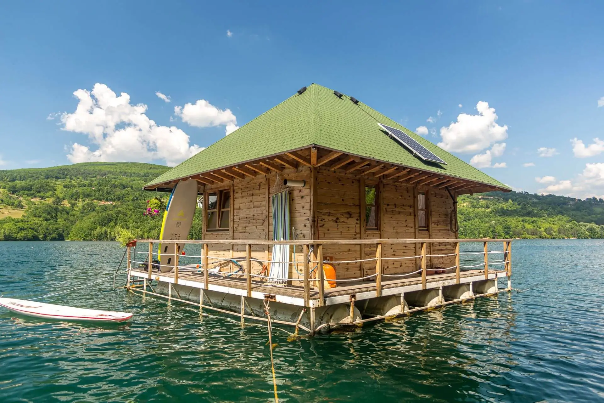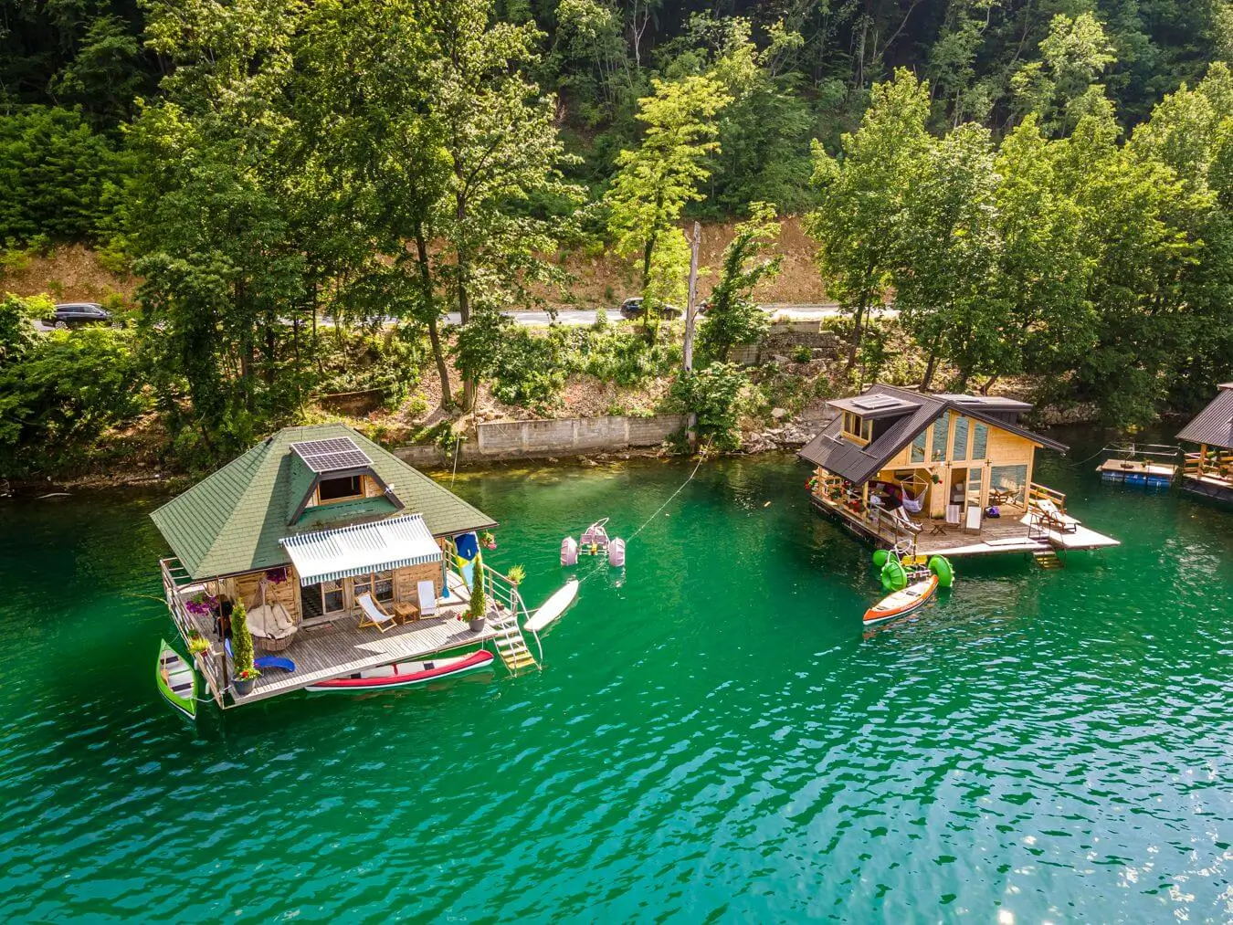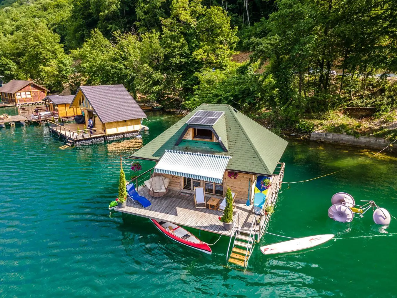 Kućica na vodi 3 – Splav 2 se nalazi na jezeru Perućac i se sastoji od dva nivoa, poseduje komfornu terasu koja je opremljena za kupanje, sunčanje i uživanje. U prvom nivou je dnevni boravak i kuhinja u kojima je spoj prirodnih materijala i modernog izgleda. Spavaći deo kuće je na spratu, sa dve odvojene spavaće sobe iz kojih se pruža pogled na jezero. Splav je opremljen solarnim panelima, kompletnom kuhinjom sa frižiderom i šporetom na plin, toplom tehničkom vodom, osvetljenjem i kompletnim kupatilom.
